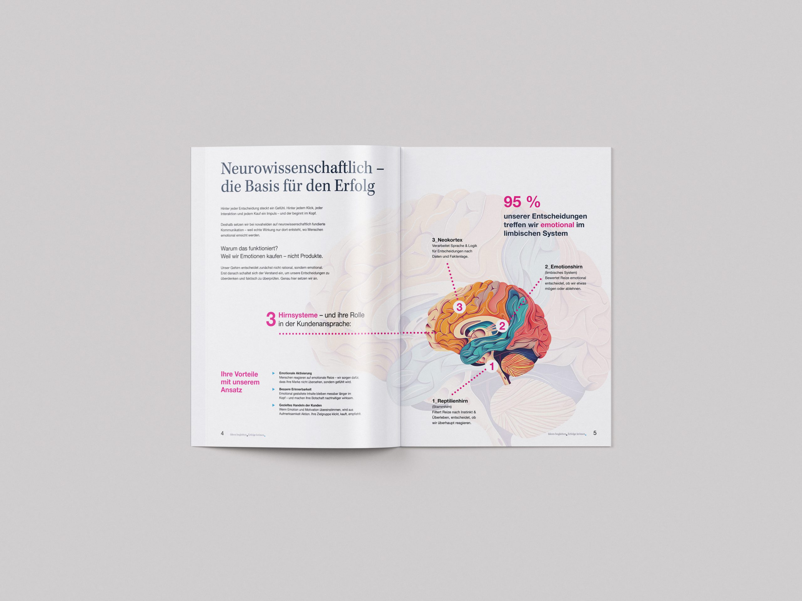 Entwicklung einer klaren Broschüren-Dramaturgie: Einstieg über den Claim „Wer Spuren hinterlassen will, braucht Heldenwerk.“, anschließend eine strukturierte Herleitung des Ansatzes und der Methodik – von Wirkprinzip/Neurowissen über Kampagnen-Logik bis hin zu Automatisierung und konkreten Vorteilen. Visuell entstand ein konsistentes Layout- und Infografiksystem, das Inhalte schnell erfassbar macht und die Wiedererkennbarkeit der Marke stärkt.